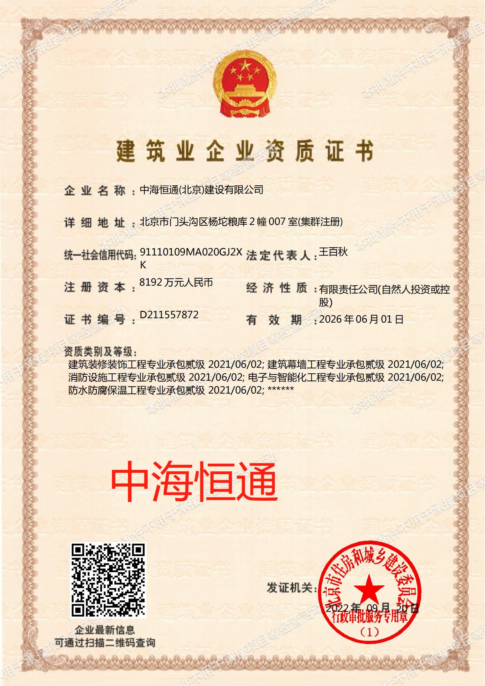 住建部中海恒通(北京)建設有限公司資質查詢